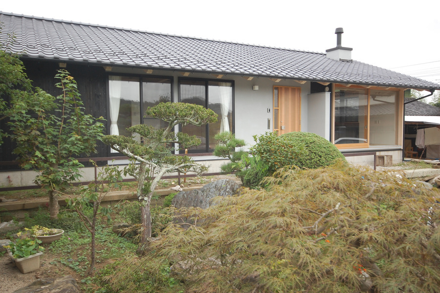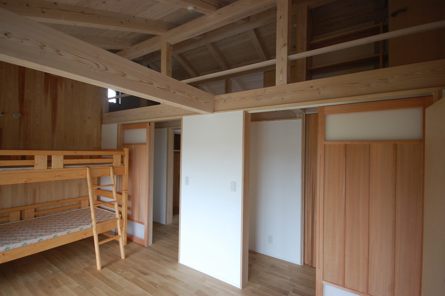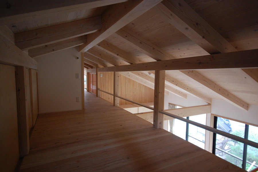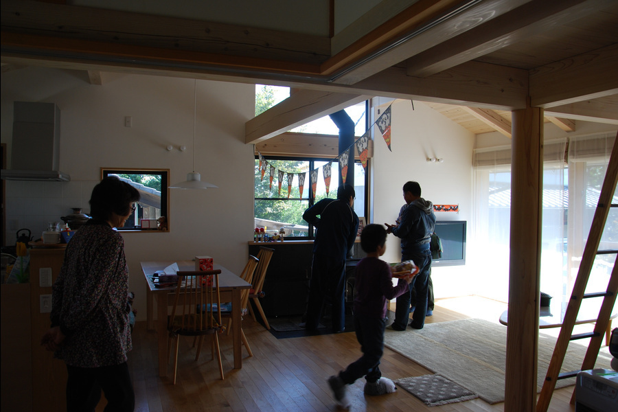 震災で壊れた主屋の建替えです。若いご夫婦と2人の御子さんの為に、切妻、ひと屋根の平屋の家を作りました。切妻の棟部分はをロフトとしました。ロフトは寝室から子供部屋、玄関を通りリビング・ダイニングの吹き抜けへと通して行きます。暖房は薪ストーブで約30畳の広さを暖めます。