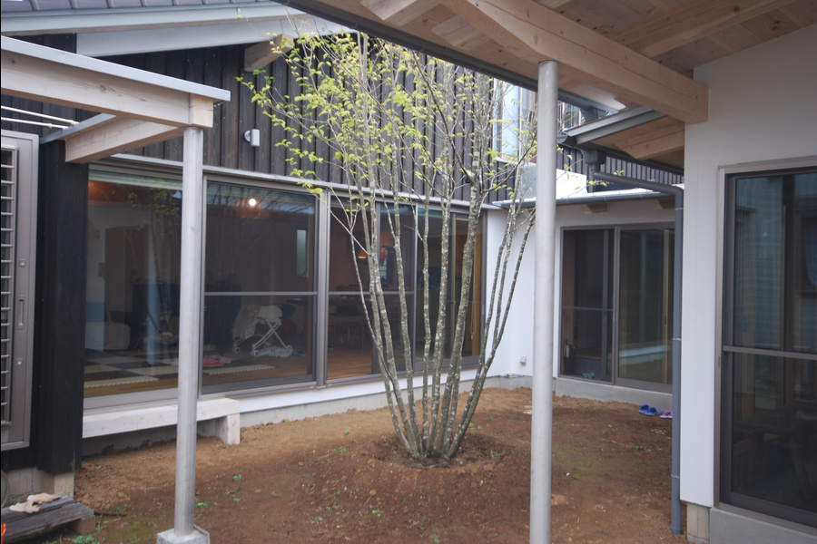 コの字型のセミコートハウス 南側にアトリエ、北にはリビングダイニングがあり玄関がそれらをつなぎコの字になっています。中庭はタモの木、囲む開口部は全て掃き出しテラス戸です。アトリエには将来陶芸窯が入る予定です。 建設地 茨城県つくばみらい市 構造 木造軸組工法 規模 2階建 延136m2 屋根 瓦、ガルバリウム鋼板 構造材 柱-桧、梁桁-杉 中央台の家 矢津の家・事務所 ページトップへ