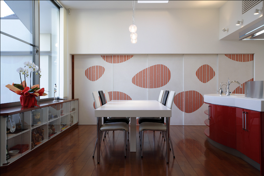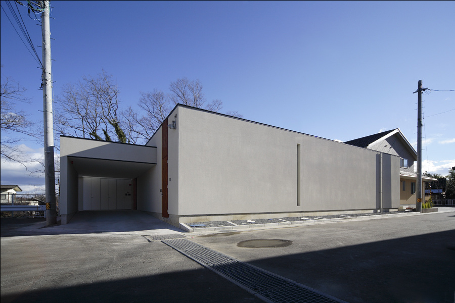 平屋の希望と敷地のロケーションにより、この大きなケヤキの木を包むように計画を進めていきました。北側にガレージを設け、ここからこの家が始まるように考えました。西側道路は道路との離れが十分取れず、又西日を避けるため塀のように閉じることとしました。外周を閉じ大きく開口部をとりました。室内に入るとケヤキの木との別世界が広がります。廊下を進むと最後は東端の空中デッキに出ます。