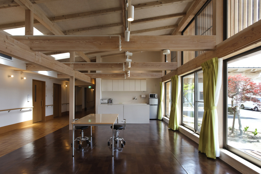 デイルームは囲まれた陽当たりのよいコートに向けられ外と連続性のある、開放的な空間となっています。